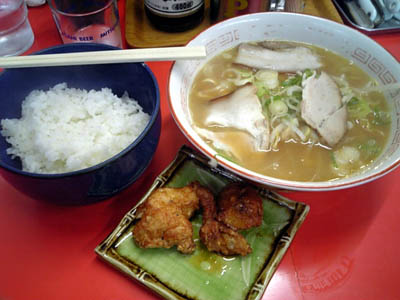 ラーメンとライス。からあげのセットである。