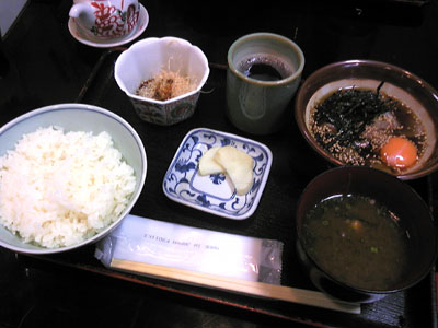 生卵、ゴマ、海苔の入った特製の醤油ダレに