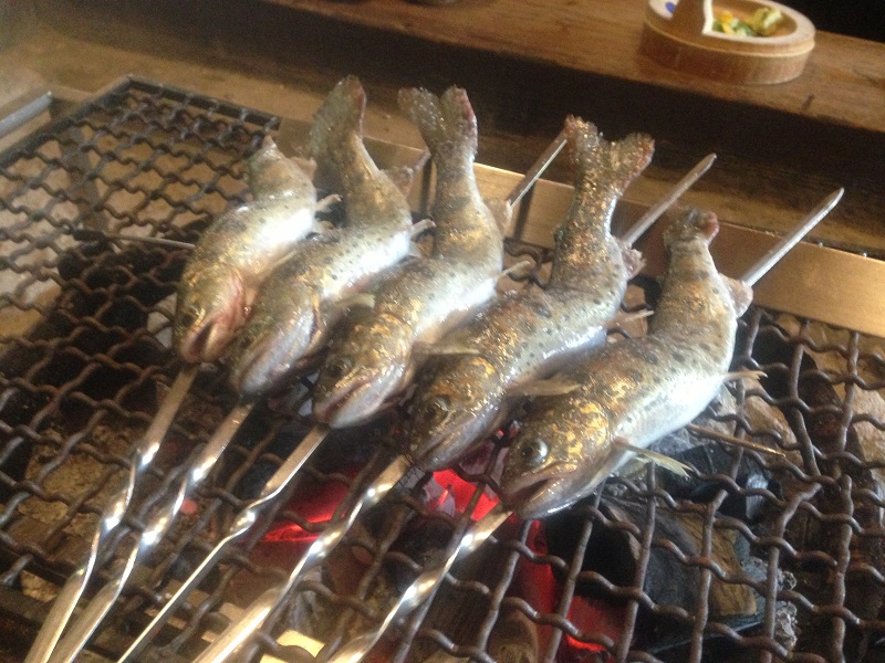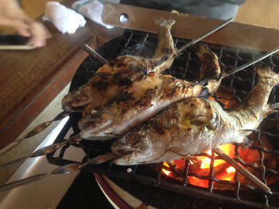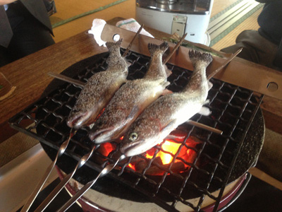 ヤマメを生きたまま焼きまーす。